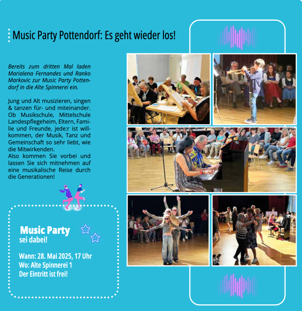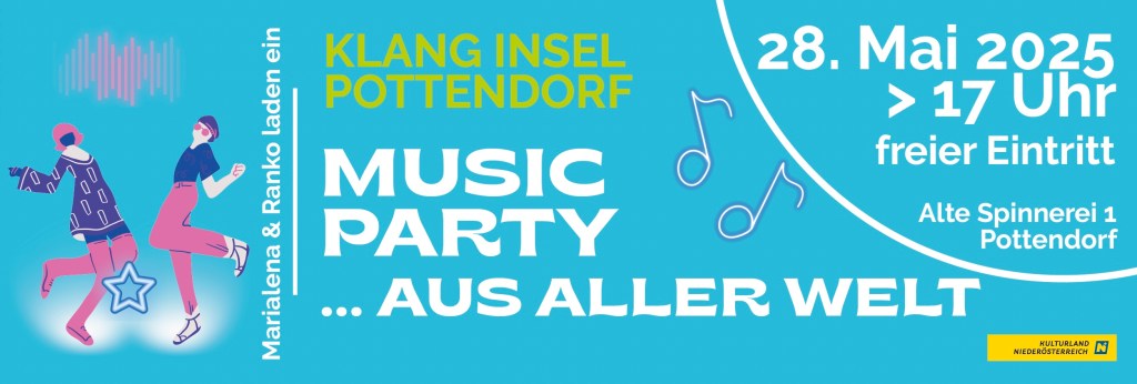 Der Verein Klang Insel Pottendorf geht in sein drittes Wirkungsjahr. Bei der Music Party in der Alten Spinnerei Pottendorf erwarten dich viel Musik und Spass – mit Schüler:innen, Lehrer:innen und weiteren Gästen aus den lokalen (Musik-) Schulen und dem Landespflegeheim. Marialena Fernandes und Ranko Markovic koordinieren, moderieren und spielen zum Walzertanze auf! Inklusiv und ohne Genre-Grenzen.